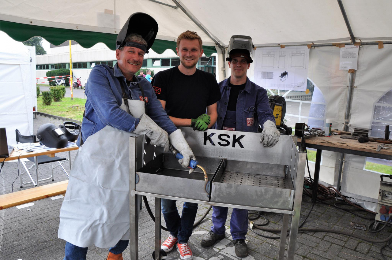 Das sich die KSK auf Wärmeübertragung versteht ist nichts Neues - im Bereich der Bratwurst allerdings schon. Dennoch ist uns die Premiere im Grillbau dank vieler unterstützender Hände der HSC Handballer geglückt. Gemeinsam wurde der Grill nach eigener Konstruktion während des 25. jährigen Vereinsjubiläums vorgerichtet und zusammengeschweißt (im Bild v.l. Barthold Budde, 1. Vorsitzender des HSC Haltern-Sythen). Am 07.10.2017 war es dann endlich soweit und der neue Grill konnte beim Meisterschaftsspiel der 1. Herren erfolgreich in Betrieb genommen werden.