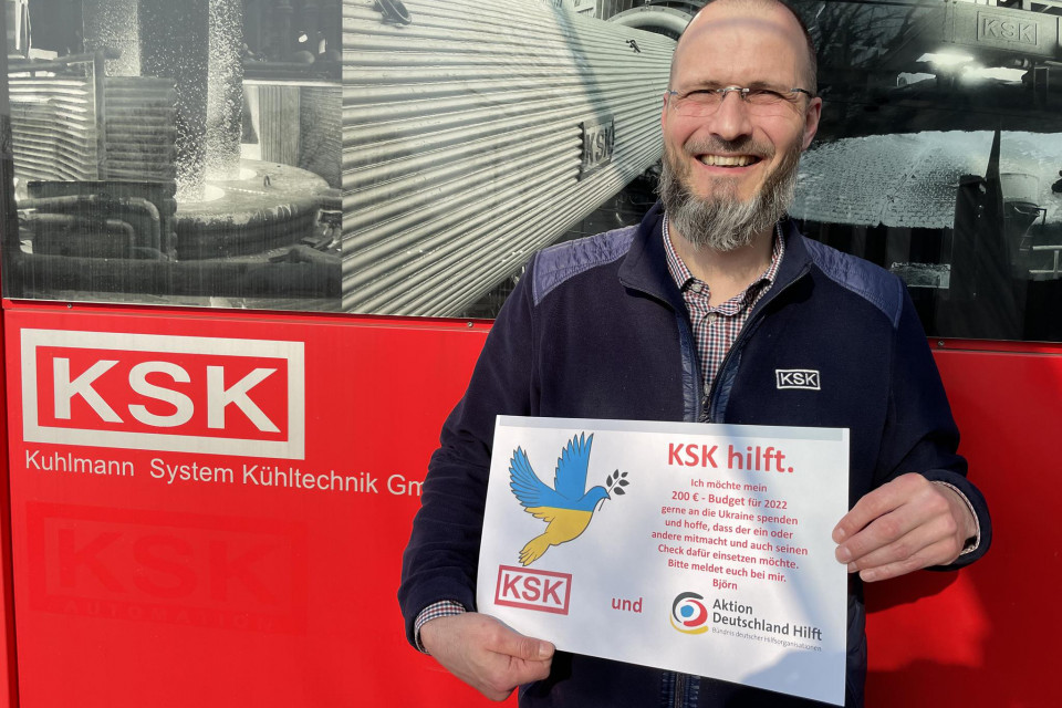 „Seit Beginn dieses Jahres haben wir bei der KSK ein tolles Programm zur Mitgestaltung im Unternehmen.“, berichtet Björn Lieberandt, Fertigungsleiter bei der KSK und Initiator des Spendenaufrufs. „Alle Mitarbeitenden erhalten vom Unternehmen ein Budget von 200 Euro pro Jahr, welches sie für KSK-interne Investitionen zur Verbesserung von Sicherheit, Produktivität und Gemeinschaftsgefühl oder für soziale Projekte einsetzen können.“ Für Björn Lieberandt war schnell klar, dass er sein Budget vollständig zur Unterstützung der notleidenden Menschen in und aus der Ukraine nutzen möchte. „Natürlich fallen mir auch ausreichend Dinge ein, für die ich mein Budget innerhalb der Firma verwenden könnte. Aber solange ein Krieg mitten in Europa Menschen in Not bringt, gibt es sicherlich Wichtigeres, als die eigene beschränkte Wirklichkeit.“